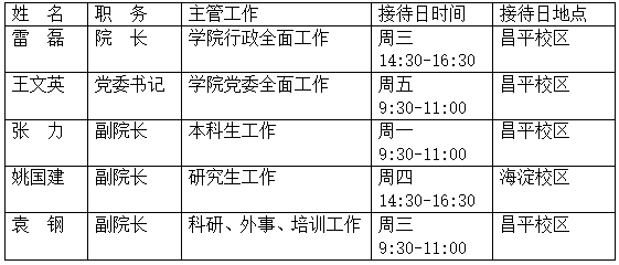院领导接待日自3月3日起开放,来访同学需提前3-5个工作日通过电子邮件方式进行预约,学院办公室将及时安排并通知来访者。各位老师根据需要,可按照以上具体安排前往。