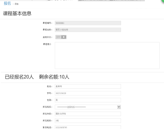 2、 注册完成之后登录,在系统中点击“报名申请”进入报名须知界面,阅读须知(可下载打印),阅读完报名须知后点击下一步进入选择课程界面,选择需要报名的课程(2020春行政法诊所)查看对应的课程信息,同时完善基本报名信息,基本信息上显示该课程的报名人数和已报名人数。