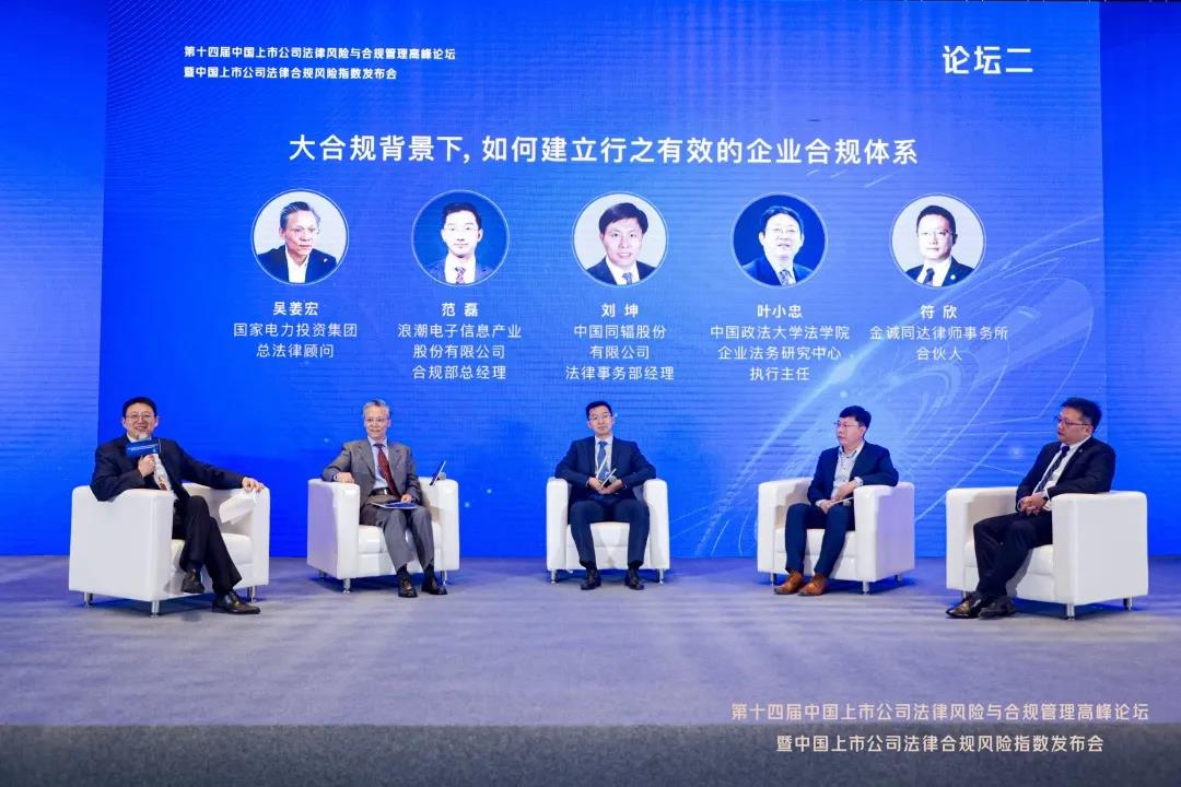 国家电力投资集团总法律顾问吴姜宏、浪潮电子信息产业股份有限公司合规部总经理范磊、中国同辐股份有限公司法律事务部经理刘坤、yL23411永利官网登录yL23411永利官网登录企业法务研究中心执行主任叶小忠、金诚同达律师事务所合伙人符欣律师,分别从各自的角度出发为企业提升依法合规经营管理的水平,保障企业行稳致远建言献策。