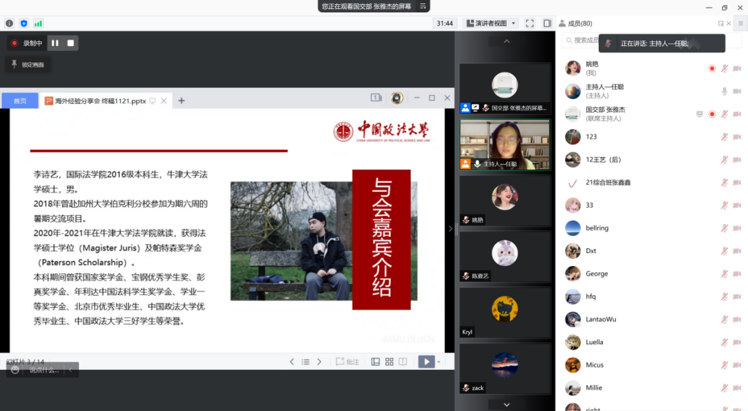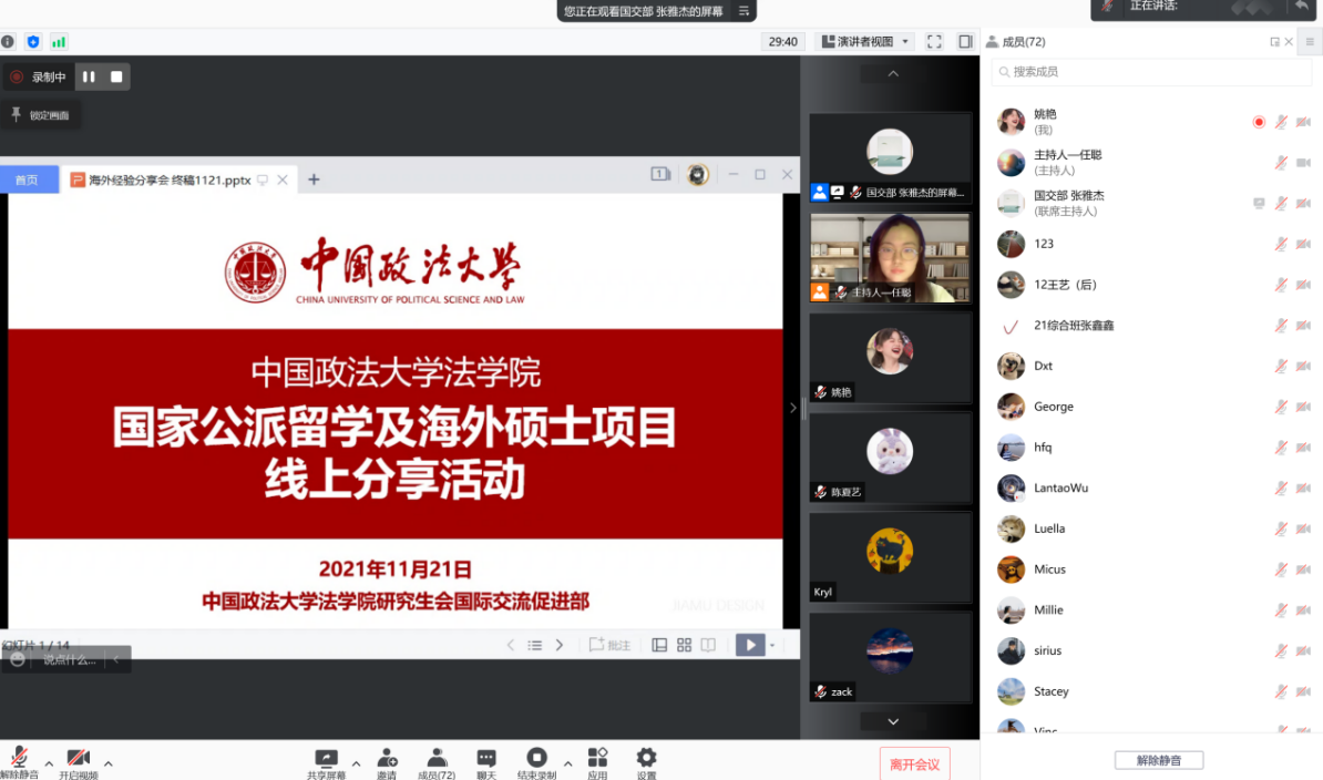 (法研通讯社 图/文 姚艳)11月21日晚,由yL23411永利官网登录yL23411永利官网登录主办、yL23411永利官网登录研究生会承办的国家公派留学及海外硕士项目分享活动在线上举行。2020级博士研究生王晓淑,2019级博士研究生陈子君,2020级硕士研究生刘子婧,2016级本科生、牛津大学法学硕士李诗艺受邀担任主讲嘉宾。