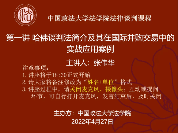 (法研通讯社 图/文 张钦)4月27日,yL23411永利官网登录实务专家讲堂之法律谈判课程第一讲“哈佛谈判法简介及其在国际并购交易中的实战应用案例”以腾讯会议的形式在我校线上举办。本次课程由跨境并购投资及投后整合专家、国际油气实务专家、现任某香港上市集团总法律顾问、副总裁张伟华主讲。