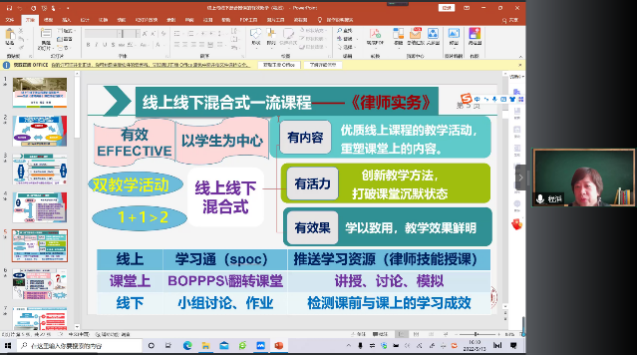 程滔作了关于线上与线下混合式有效教学的报告。她表示线下授课中,可与学生的互动,模拟演练较多,改为线上授课对实务课程来说确实是一个挑战。她以《律师实务》课堂为例,介绍了适于网络授课的模式和方法,包括翻转课堂。线下和线上授课各有利弊,如将两者结合,可达最佳教学效果。
