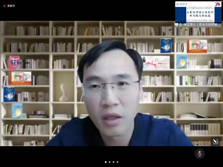 袁治杰作题为“当前法律硕士教育面临的新问题与新机遇”的主题报告。他主要从非法本法硕的教育出发,指出了当前法律硕士面临的新问题与新机遇。他指出法考对法律硕士的培养影响重大,法考的改革也势必对当下的培养模式造成冲击,可能会导致就业率降低和招生指标削减等消极影响。这一改革也存在着积极方面的影响,如使得学习时间的分配更加合理等。同时袁教授还指出,当下的法律人才培养体系十分多样,亟需通过实践中的经验加以调整。