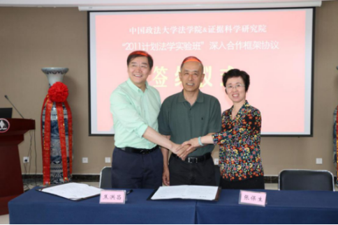 签约仪式在法大鉴定研究所学术报告厅正式举行,由王旭院长主持。司法文明协同创新中心秘书长柳经纬宣读“共建’2011计划法学实验班’合作协议”,张保生、焦洪昌、王旭教授分别代表三方签署《合作协议》。
