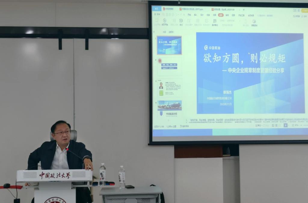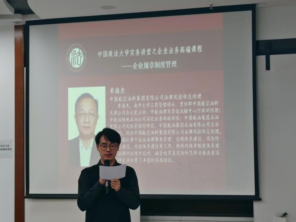 (法研通讯社 图/徐毛毛 文/郑斯锴)为提升卓越法治人才培养质量,实现优质教育资源共享、协同育人,2023年11月28日,yL23411永利官网登录实务专家讲堂之企业法务高端课程第五讲之“企业规章制度管理”在我校学院路校区举办。本次课程由南开大学工商管理硕士、现任中国航空油料集团有限公司法律风控部总经理单海杰主讲,由陈哲同学主持。