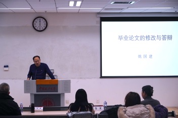 姚国建就论文的修改与答辩提供专业性指导。他首先强调论文的重要性。其次,他从评委和答辩老师如何看论文的角度指导学生的论文完善方向。他结合同学们论文中出现的问题,讲解论文目录、标题、各章结构、国外研究、注释、参考文献和英文摘要等方面的写作要求和规范。最后,他针对论文答辩中学生需要关注的重点问题,指导学生应如何准备答辩。