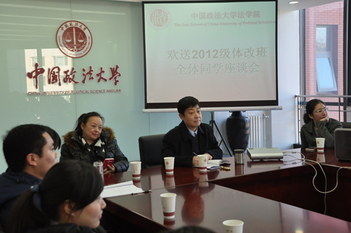 随后2012级体改班的同学们分别就自己的学习生活和实习经历中的感想进行了交流,每个人都不约而同地表示,他们为自己是一名法大人而骄傲,并希望在今后能尽自己的绵薄之力为法制事业做出应有的贡献。
