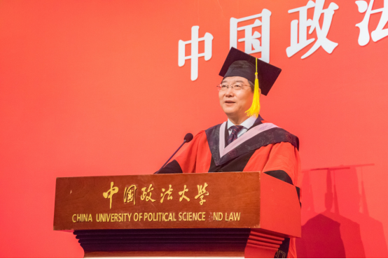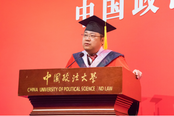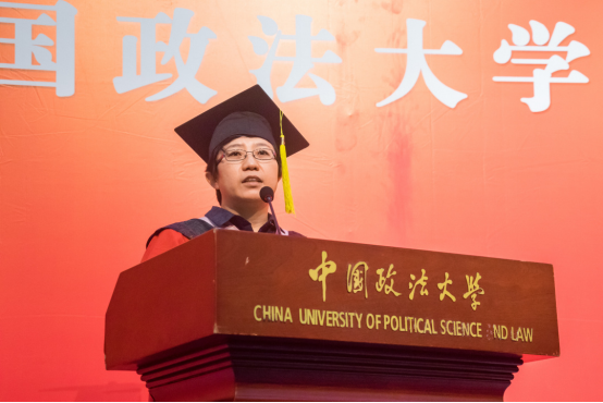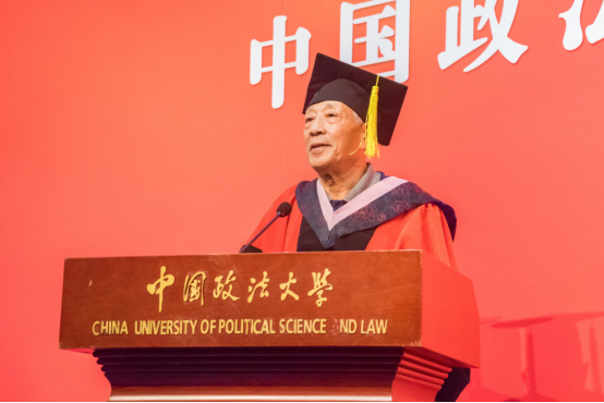 随后,廉希圣老师上台致辞。他首先祝贺大家毕业快乐,并回忆起了65年前毕业的场景。他告诫大家,大学的课程只是一个基础,在走向社会的过程中,学习的知识会更加丰富,会遇到很多从未见过的问题。因此大家不能够轻易满足,要记住学无止境,真正的学习开始于大学毕业以后。此外,他强调同学们要拥有学术造诣,但不能脱离实际,走向社会后要认真研究中国的国情。最重要的是,不能妄自菲薄,要相信自己的能力。不论以后去向何方,都能遇到无处不在的法大人。