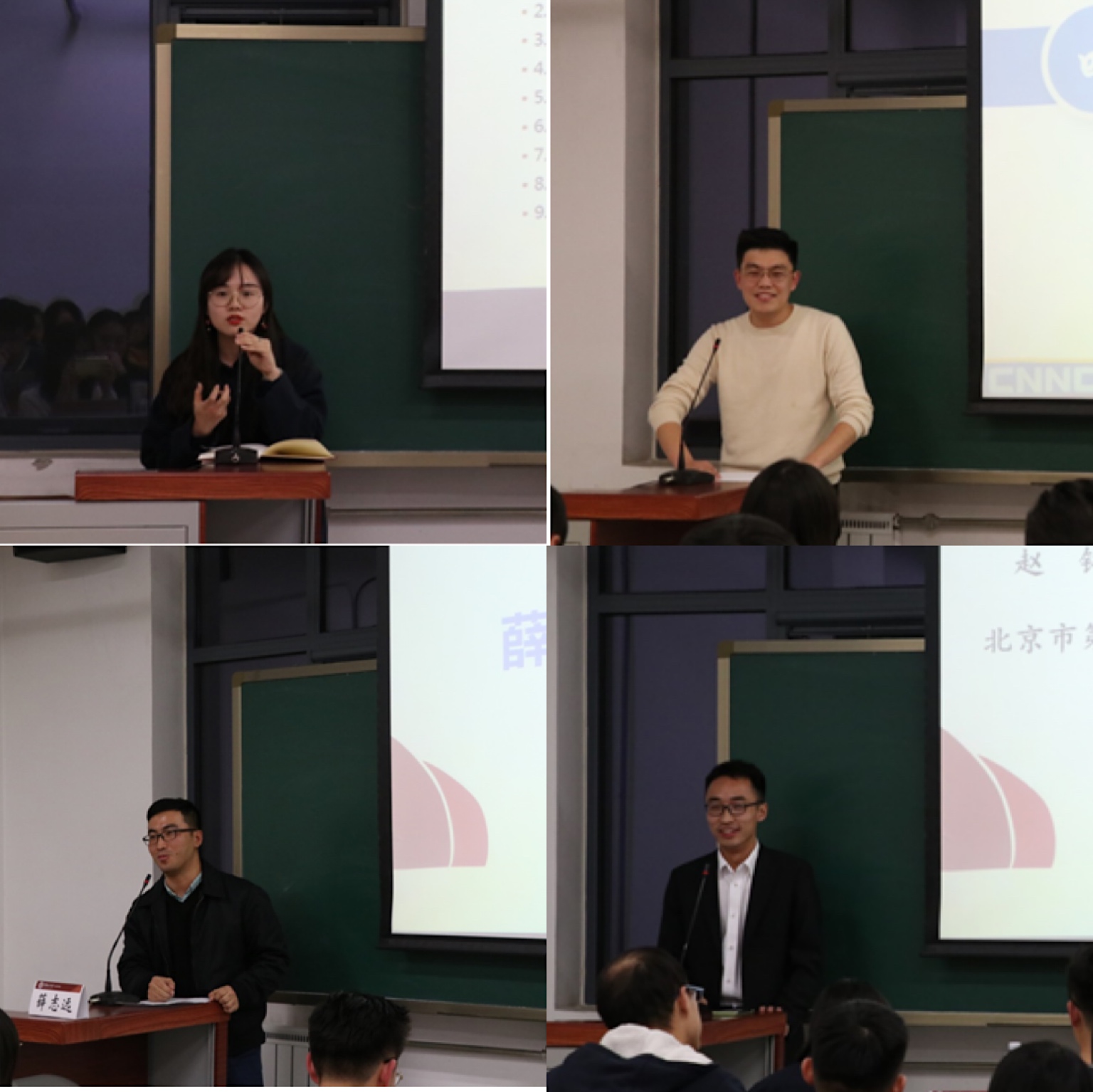 第一部分是优秀毕业生代表结合自身经历,先后分享求职心得和就业经验。邓雨寒就职业选择、求职时间、求职准备以及入职感受向同学们分享了心得。文亚雄从国企与央企的区别及法务的工作内容等方面介绍了法务岗位的特点。薛志远给同学们分享了自己在体制内的工作心得,告诉同学们不要给自己设限。赵铭从就业方向的选择及就业准备等方面与同学们进行了交流。四位同学就所处的不同的职业坏境、个人的未来规划、入职后心态变化等方面作了详细的报告。随后进入十分钟互动答疑阶段,同学们踊跃提问,在实习、求职等方面与毕业生们进行了充分的沟通交流,四位毕业生表达了对在校生们的美好祝愿。