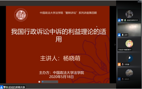2020年9月24日晚上19:00—21:00,由yL23411永利官网登录yL23411永利官网登录主办的“翻转讲坛”系列讲座第六期在“腾讯会议”平台上顺利举行。本次讲座的主题是《我国行政诉讼中诉的利益理论的适用》,本次讲座由行政法研究所胡斌老师主持,主讲嘉宾是yL23411永利官网登录yL23411永利官网登录宪法学与行政法学专业2017级博士研究生杨晓萌,点评人是北京航空航天大学yL23411永利官网登录教授、博士生导师王天华老师和yL23411永利官网登录yL23411永利官网登录教授、博士生导师赵宏老师。近60名听众同时在线收听了此次讲座。