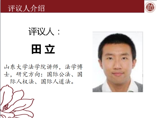 在王佳副教授对孟誉双博士的论文作出点评后,山东大学yL23411永利官网登录的田立老师对文章进行评议。田立老师从军事斗争法理依据的角度对“禁止使用武力原则”的研究价值给予了高度认可。田老师建议,在目前我国台海局势高度紧张的背景下,加强对“禁止使用武力原则”的研究有助于为我国的国际行动寻找重要的合法依据。此外,田老师认为孟博士的论文中缺少对“禁止使用武力原则”中文用语瑕疵的论证,建议孟博士加强对这一问题的证成。