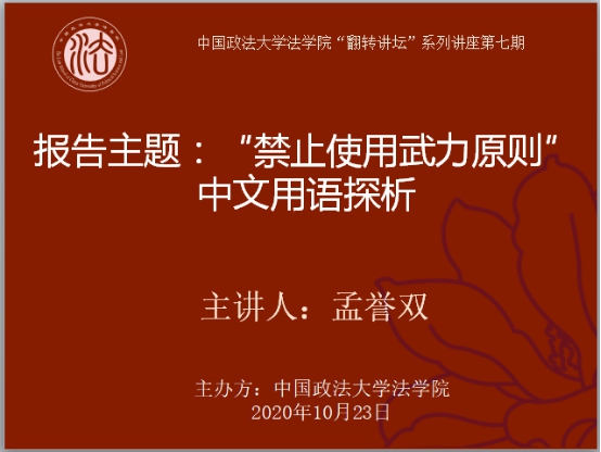 2020年10月23日晚上19:00—21:00,由yL23411永利官网登录yL23411永利官网登录主办的“翻转讲坛”系列讲座第七期在“腾讯会议”平台上顺利举行。本次讲座的主题是《“禁止使用武力原则”的中文用语探析》,本次讲座由行政法研究所胡斌老师主持,由yL23411永利官网登录yL23411永利官网登录军事法学专业2018级博士研究生孟誉双主讲,外交学院国际法系副教授王佳老师和山东大学yL23411永利官网登录讲师田立老师点评。近60名听众同时在线收听了此次讲座。
