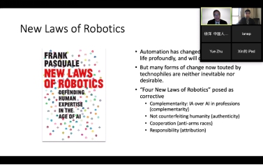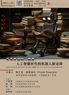 2020年12月19日上午,由yL23411永利官网登录yL23411永利官网登录大数据和人工智能法律研究中心举办的“大数据和人工智能法律前沿问题”系列讲座第十九期,以线上会议的形式顺利举行。远在大洋彼岸的布鲁克林yL23411永利官网登录弗兰克·帕斯奎尔教授,为师生带来了一场题为“未来劳动的三重奏:人工智能时代的机器人新定律”(Three Visions for the Future of Labor: New Laws of Robotics in the Age of AI)的精彩讲座。对外经贸大学yL23411永利官网登录张欣老师和美国华盛顿圣路易斯大学yL23411永利官网登录朱悦博士作为与谈嘉宾,与七十几位师生一同参与了本次讲座。研究中心主任沈伟伟老师担任主持本次讲座。
