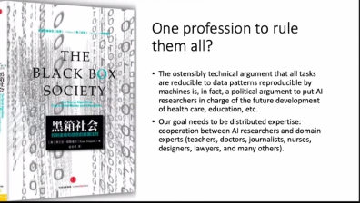 紧接着,帕斯奎尔教授阐释了他的新作《New laws of robotics》一书提出的机器人四大新定律,即互补性、真实性、协作性以及可问责性。在对比人类和人工智能的专业能力方面,他进一步将知识进行了理论上的区分,即专业知识和外行知识。同时他认为削弱专家力量的,一部分来自民主,还有一部分来自一些“元专业知识”(Meta-expertise)。为了进一步阐释这个问题,帕斯奎尔教授回到其旧作《黑箱社会》一书,指出我们的目标需要根据知识的不同性质划分专业知识,让人工智能和专家可以在其各自的知识领域深耕,从而让人工智能研究人员和领域专家能够达成合作。