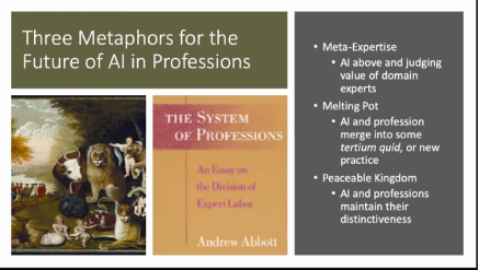 最后教授提出了未来职业人工智能的三个隐喻。首先,是元专业知识(Meta-expertise),即人工智能与领域专家的价值判断。其次,是大熔炉(Melting Pot)即人工智能和专家融合成了新的结合体。最后,是Edward Hicks名画“和平王国“(Peaceable Kingdom)这一隐喻,即人工智能和专业人士并行不悖,保持他们的独立性和区分度。