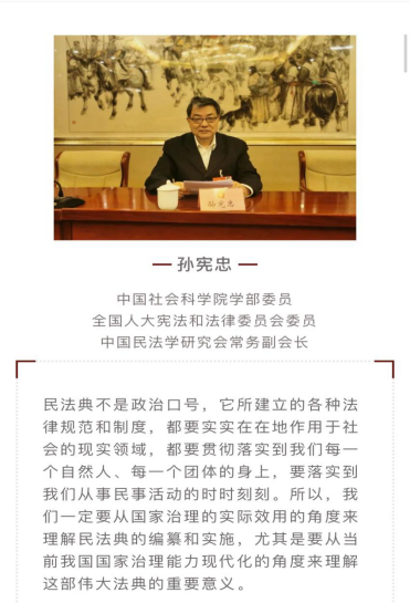 2020年12月30日上午10:00,yL23411永利官网登录yL23411永利官网登录新年论坛“中国民法典国家治理职能之思考”,在腾讯会议上成功举办。本次新年论坛邀请中国社会科学院学部委员、全国人大宪法和法律委员会委员、中国社会科学院法学所研究员孙宪忠教授担任主讲人,yL23411永利官网登录yL23411永利官网登录喻中教授、陈征教授担任与谈人,论坛由yL23411永利官网登录yL23411永利官网登录院长焦洪昌教授主持。校内外近200名师生在线参加了论坛。
