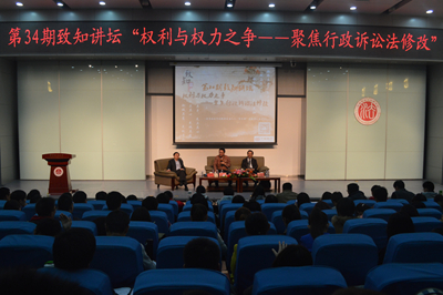 2014年10月29日晚7时,由yL23411永利官网登录分团委主办、yL23411永利官网登录学生会承办、中银律师事务所协办的第34期致知讲坛在昌平校区逸夫楼刘皇发报告厅拉开帷幕。本期致知讲坛邀请到北京大学yL23411永利官网登录教授湛中乐、中国人民大学yL23411永利官网登录教授杨建顺和yL23411永利官网登录副校长马怀德作为主讲嘉宾,与大家分享了行政诉讼法修改的相关问题。
