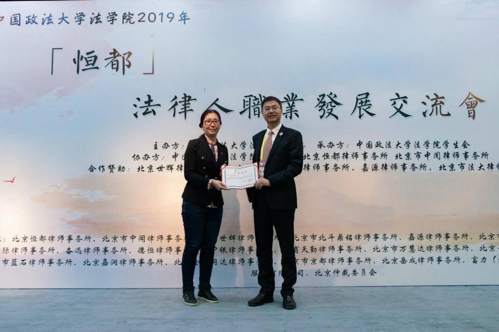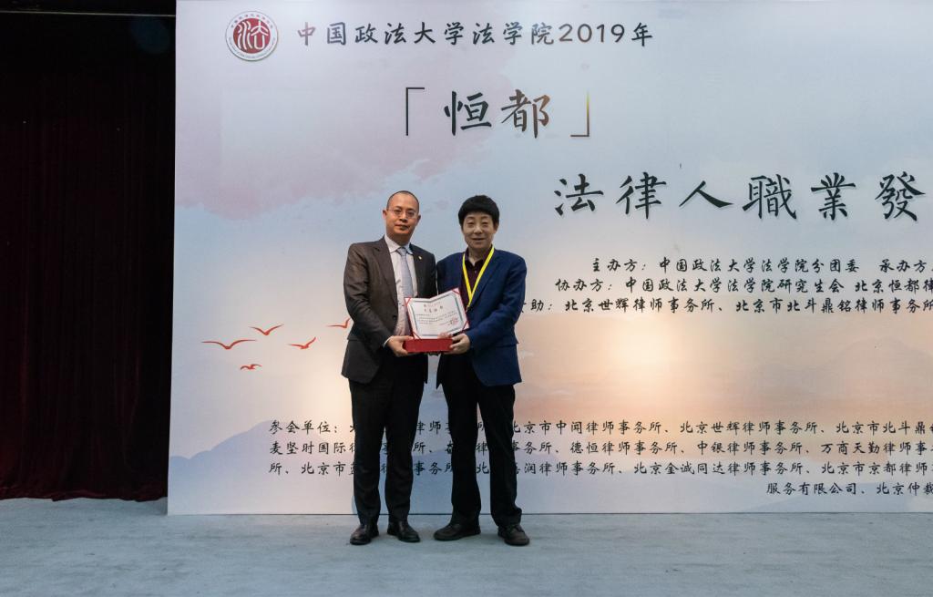 在随后的赠礼仪式上,yL23411永利官网登录分党委书记刘大炜老师和yL23411永利官网登录分团委书记杨婷婷老师分别向赞助商北京恒都律师事务所和北京市中闻律师事务所的代表赠送精美礼品并合影留念。