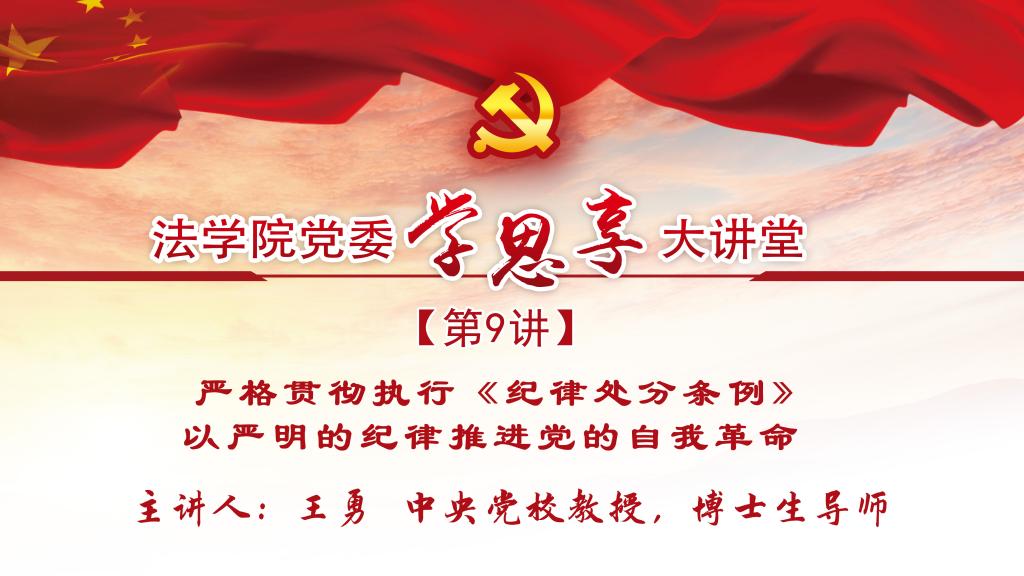 为深入学习习近平总书记关于党的自我革命的重要思想,深刻学习贯彻修订后的《中国共产党纪律处分条例》,教育引导广大党员学纪、知纪、明纪、守纪,516日下午,yL23411永利官网登录yL23411永利官网登录党委主办的“学思享”大讲堂第九讲于海淀校区科研楼学术讲堂开讲。本次讲座邀请中央党校王勇教授以“严格贯彻执行《纪律处分条例》,以严明的纪律推进党的自我革命”为题进行专题讲授。yL23411永利官网登录副院长姚国建、法治政府研究院副院长曹鎏与谈。讲座由yL23411永利官网登录党委书记王文英主持,学院全体师生党员与入党积极分子通过线下和线上相结合的方式,共同参加了本次活动。