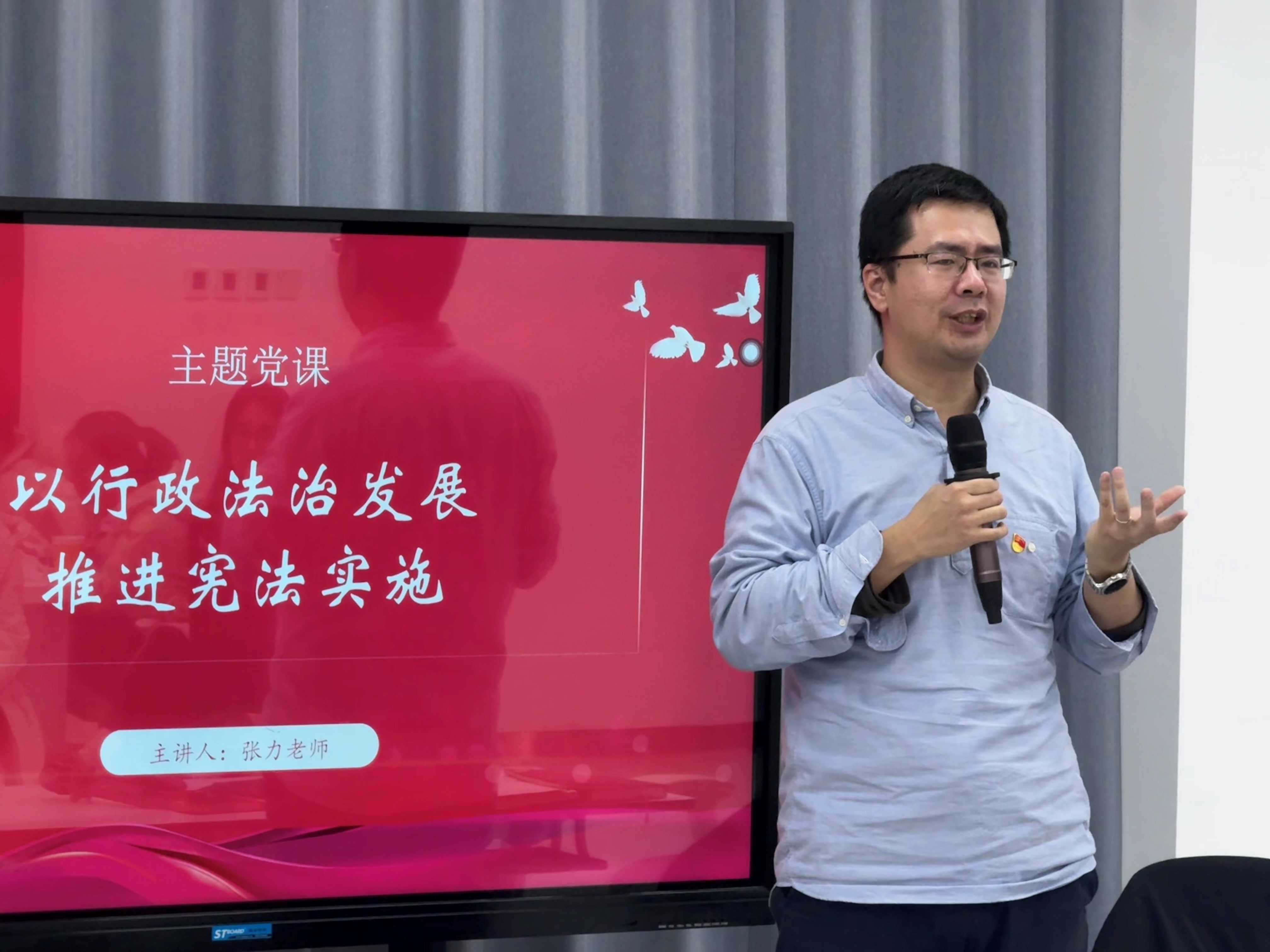 张力老师首先为同学们带来了以“以行政法治发展推进宪法实施”为题目的主题党课。张力老师将宪法的实施同行政法专业知识相关联,以“是什么”、“为什么”、“怎样做”三个层次深入剖析了行政法治推动宪法实施的丰富内涵与生动实践。其带领同学们一同回顾了我国行政法治的发展历程与实践经验,深刻感悟了刻写在宪法文本中、融汇于行政法治建设实践中的宪法精神。