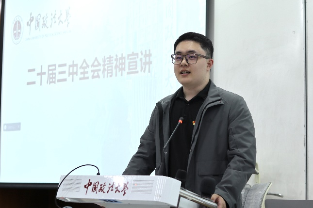 会议伊始,校二十届三中全会精神宣讲团成员高泽宇同志以“党的二十届三中全会谋篇布局中的战略先手”为题,对二十届三中全会精神进行解读与宣讲。高泽宇同志从三中全会的历程出发,围绕习近平总书记的重要讲话内容,从科技与人才布局、“四个自信”、“四个意识”、党的建设等角度出发,对党的二十届三中全会精神与意义作出解读。