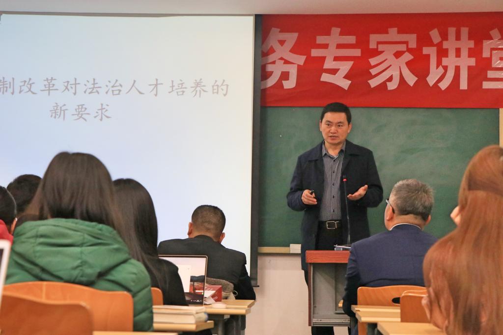 (法研通讯社 图/文 朱颖超)为了贯彻落实习近平总书记考察法大时5.3重要讲话精神,将优质实践教学资源引进高校,培养高质量“职业化、应用型”卓越法律人才,yL23411永利官网登录于11月8日在我校学院路校区举办了实务专家讲堂,邀请了江苏睢宁法院党组书记、院长袁长伟担任主讲人,主题是《司法体制改革对法治人才培养的新要求》,yL23411永利官网登录研工办主任陈维厚副教授主持讲堂。