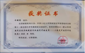 永利官网共三名同学取得佳绩,分别是许耀乘同学一文《禁止权利滥用原则在规制著作权滥用中的适用——以视觉中国事件为视角》获特等奖,由冯晓青老师指导;刘衡同学《任意诉讼担当视域下著作权商业维权现象分析》获研究生组二等奖,由佘力焓老师指导;龙书培同学《著作权纠纷中电子存证的审查与认定研究》获研究生组二等奖。其中我校共5人获奖,yL23411永利官网登录获奖同学3名,占比60%,其中特等奖获得者许耀乘同学以《禁止权利滥用原则在规制著作权滥用中的适用——以视觉中国事件为视角》为题作为本次研讨会的主旨演讲人之一,在会议现场发表了自己的看法。