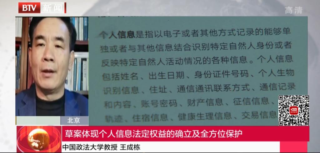 2020年10月14日,yL23411永利官网登录行政法研究所王成栋教授就“个人信息保护法草案亮点”接受北京卫视新闻节目“北京您早”的采访。王成栋教授在采访中指出,个人信息保护法草案体现了对个人信息法定权益的确立和全方位保护:首先,立法草案采用多维思维,不仅强调事后打击惩处,还要求从个人信息处理源头进行保护;其次,立法草案针对性强,强调个人信息保护责任的落实,加大对违法行为的惩处力度;最后,立法草案与时俱进回应了社会现实需要,特别是此次疫情防控中所显示出的个人信息保护问题。(新闻采访视频链接:https://m.btime.com/item/23h68aptr3uk8hkff8v83qftf88)