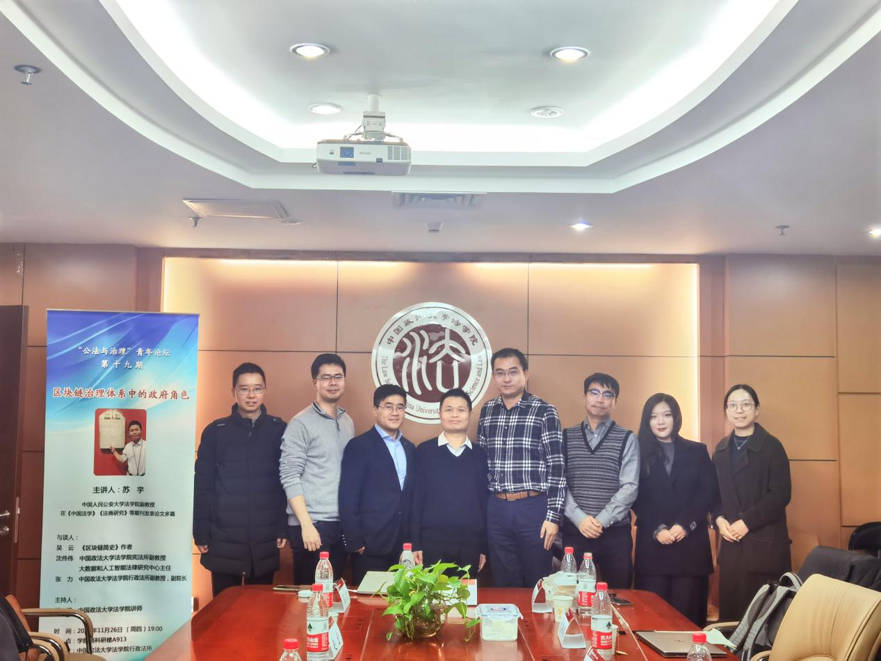 20201126日晚,由yL23411永利官网登录yL23411永利官网登录行政法研究所主办的第19期“公法与治理”青年论坛在yL23411永利官网登录研究生院科研楼A913会议室圆满举行。本次论坛由yL23411永利官网登录yL23411永利官网登录行政法所胡斌老师主持,主讲嘉宾为中国人民公安大学yL23411永利官网登录副教授、中国人民公安大学数据法学研究院院长苏宇副教授,论坛主题为“区块链治理体系中的政府角色”。出席讲座和参与与谈的嘉宾包括《区块链简史》作者吴云先生,yL23411永利官网登录yL23411永利官网登录宪法所沈伟伟副教授、yL23411永利官网登录yL23411永利官网登录行政法所赵宏教授和张力副教授、yL23411永利官网登录法治政府研究院王春蕾老师、中国人民大学教育学白紫薇博士。此外,还有十余名博士和硕士研究生聆听了此次讲座。
